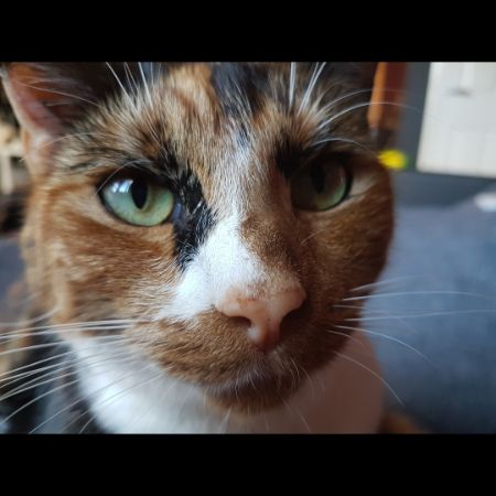 She's a chunky cat, likes to lounge out in the sun, she's a Calico cat with a white mark on her nose, and white chest. Mostly copper/brown/black l, she's friendly to cats and dogs