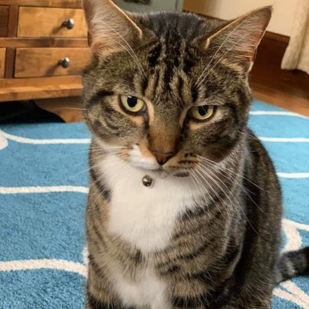 Tabby & white, white markings on paws, chest and chin. Very friendly, docile cat, will not bite or scratch even at the vet despite being deathly scared of the vet. Will readily approach strangers.