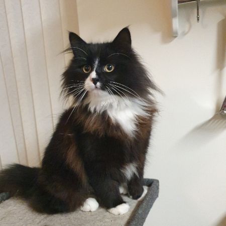 Very nosey and friendly. Mainly black with white paws, and has a white strip down his nose. White neck