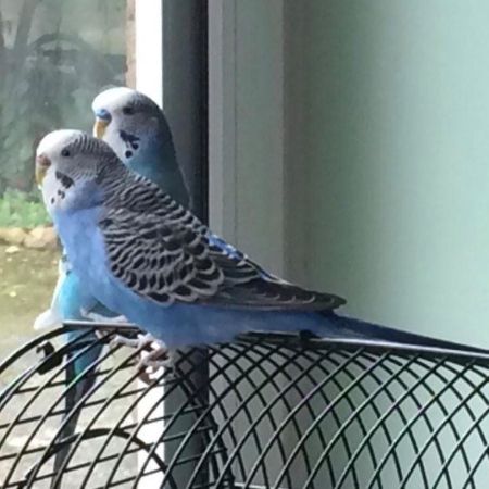 "Fred" is a friendly large plump budgie. She has a blue body with a white/grey head and brown seer. She will call back to her name.