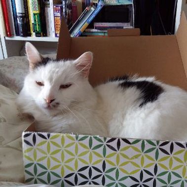 Long-haired, mostly white with some dark / tabby patches and bushy tabby tail. Yellowy / green eyes. George is 16 years old.