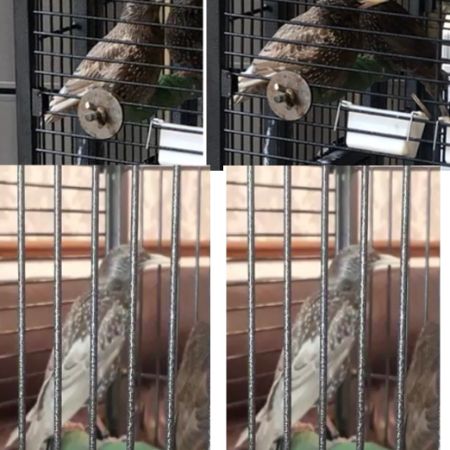 A common starling with silver/white/brown colours. Has a blue ring on his right leg. Sings occasionally.