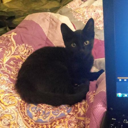 When light shines on his fur there are faint tabby markings on his body, but he is an all-black kitten, yellow eyes with big ears. He is extremely playful - runs around chasing things, head butts your hand for strokes, can be easily picked up and carried anywhere.