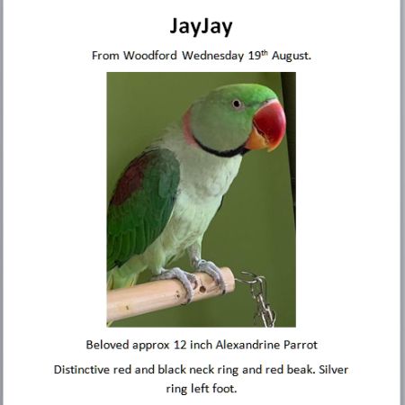 Report your missing bird on our Bird Registers for free and we will do a pet match to display any birds which match in the area. You can also create and print your lost bird poster. Report a missing bird here