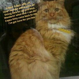 Coppa was last seen on our drive, Wednesday 16th Sept. He isn't a big roamer, and is normally in tuna smelling range.