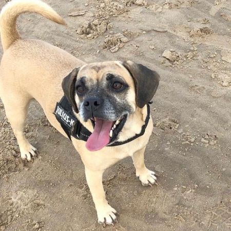 She is a pug crossed with a beagle. She is a bit chunky and has dark floppy ears. A very gentle tenperament.