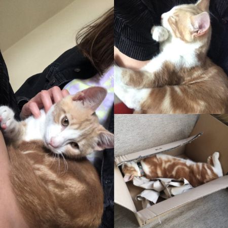 Mushu is very very friendly. He's 9months old. Neutered and microchipped. He was wearing a grey collar with reflective strips on it. He's a champagne ginger and white cat with 4 white socks and a stripe pattern across his back and tail