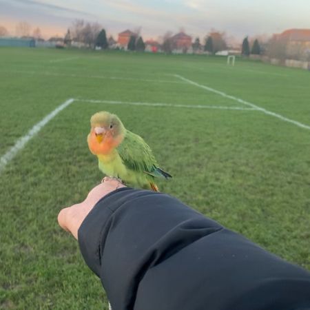 I have lost my love Bird he is still a baby fully trained he will come to you very friendly and he does fly all the time outside and he will come back For the first time that he has not come back he just flew away and in the wrong direction and he got last please contact me