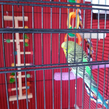 Green budgie flew away while cleaning cage, she will hop on to your finger if offered a treat or millet.