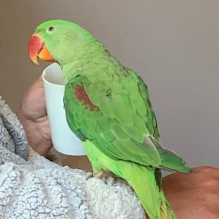 Named Charlie, he has a ring on his left foot, a speck of orange paint on his chest area, may be injured or hurt as we saw him be attacked by a crow. He is a green alexandrine parrot and has a bit of colour around his neck. He has a red beak and is afraid of new people.