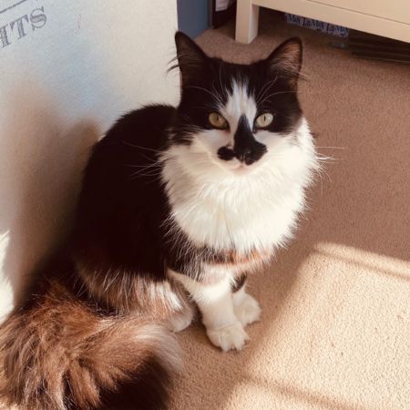 Kovu is a black and white long haired British cross. He has a little bump and black smudge on his nose and a white tip on his tail. He is 3 years old and incredibly friendly.