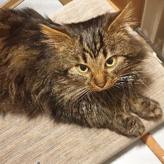 He is a very small, nervous, semi feral, long haired tabby tom. He has a distinctive nip out of his top left ear