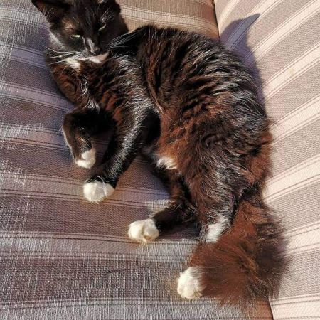 Markings: all black with white chin, chest and tummy. White paws ans white stripe down back left leg. Bushy tail and fur is a gingery tinge when in the sun.