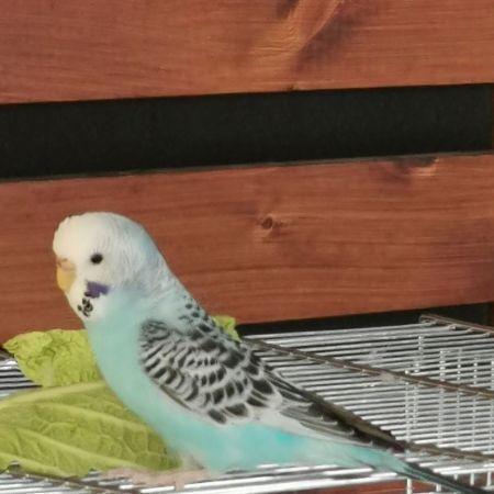 Crystal is approx 11 months old and smaller than average budgies. Crystal has white head, brownish beak, marks on cheeks, she's blue all over and her wings are black n white. She's a very curious and friendly little budgie. She happily eats millet spray from hands.