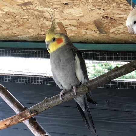 Cockatiel is normal grey male with yellow head. Slightly tame, will come and sit on head but does not like hands. Sings the Adam’s family.