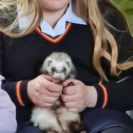 she is in season and will approach people as is super gentle and loving sable colour polecat semi long haired at the back end
