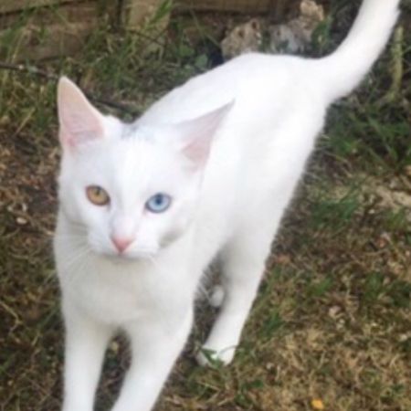 Pure White with Odd-Eyes. Blue and Yellow. Slim. Long legs. Anxious around people and will try to run away.