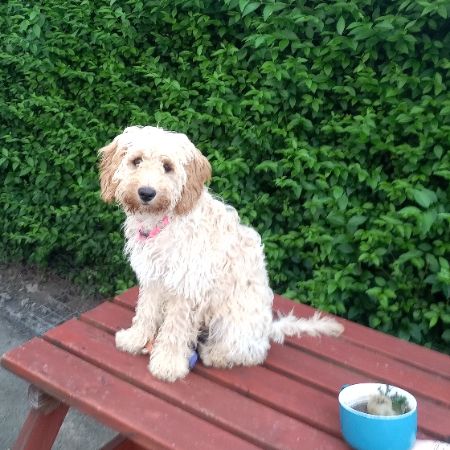 her name is honey she has a cream curly coat and ginger ears she is very timid