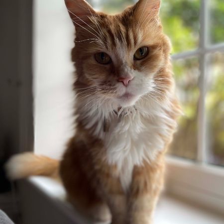Full description: 8 year old, female ginger and white Maine Coon. About 5kg in weight and large fluffy tail.
