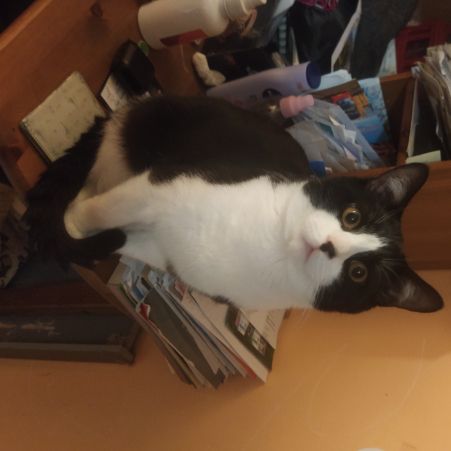 My cat's fur is black and white from his four paws to his chest to his mouth and in between his eyes and his eyes are orange. His name is Billy but me and my family sometimes call him "baby". He was lost around Yelverton Road, Battersea.